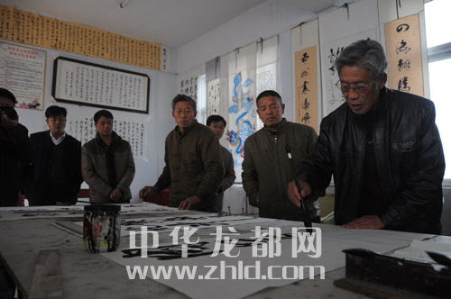 ????作為距離太康縣城最遠(yuǎn)的一個邊界鄉(xiāng)鎮(zhèn),轉(zhuǎn)樓鄉(xiāng)的文化活動開展得有聲有色。該鄉(xiāng)依托文化站,成立了在鄉(xiāng)一級少見的文聯(lián),下設(shè)書法家協(xié)會、腰鼓協(xié)會、嗩吶協(xié)會等。我們在轉(zhuǎn)樓鄉(xiāng)政府采訪時,正碰上書法家協(xié)會20多名會員在一起切磋書藝。今年74歲的許家榮是鄉(xiāng)書法家協(xié)會主席,也是《周口晚報》的老讀者,看到我們到來,老人興之所至,當(dāng)場揮毫潑墨,為本報題寫了“周口邊界行接地氣有人氣”的條幅。據(jù)了解,每逢春節(jié),書法家協(xié)會會員都會走村串戶,為村民義務(wù)書寫春聯(lián)。