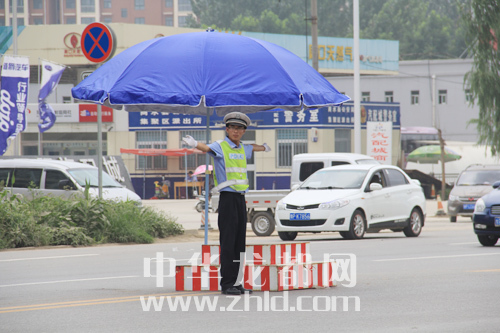 “天再熱,我們也要把交通指揮好?!?月22日12時30分,在中州大道寧洛高速路口附近,正在指揮交通的交警劉保兵對記者說。記者看到,汗水已經(jīng)浸透了他的衣背,藍色的制服由淺變深。