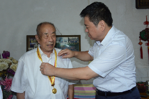 ????劉繼標(biāo)先后看望了抗戰(zhàn)老戰(zhàn)士王洪蟠、王彥林、代士清、王景明,親手為他們佩戴中共中央、國(guó)務(wù)院、中共軍委聯(lián)合頒發(fā)的中國(guó)人民抗日戰(zhàn)爭(zhēng)70周年紀(jì)念章。