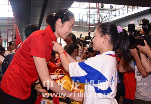 9月7日,一名學生在機場為載譽歸來的朱婷佩戴紅領(lǐng)巾。