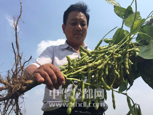 ??? 圖③ 9月25日,在西華縣逍遙鎮(zhèn)全國(guó)種糧大戶(hù)曹自堂的試驗(yàn)基地,曹自堂看著試種的大豆新品種喜出望外。記者 張猛 攝