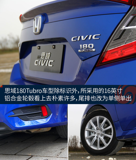 隨著思鉑睿混動車型的推出,這次走入門路線的思域1.0T也來打了個醬油。跟之前的1.5T車型相比,外形基本保持一致。鑒于其更入門的定位,輪轂的樣式看起來沒那么精致和動感了,尾排改為了單側(cè)單出的設計,車尾的動力標識也有之前的“220TURBO”改為“180TURBO”。