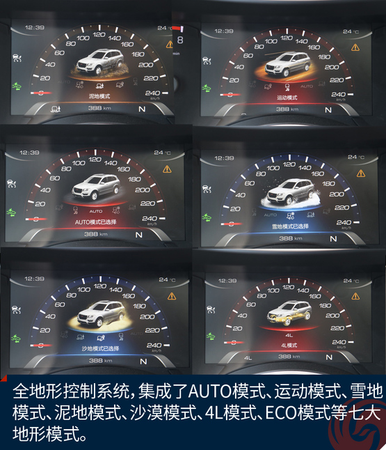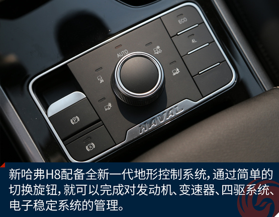 ????????四驅(qū)系統(tǒng)也是新哈弗H8的亮點(diǎn),搭載全新一代全地形控制系統(tǒng),可使駕駛者簡(jiǎn)單的旋轉(zhuǎn)旋鈕,切換駕駛模式,這套系統(tǒng)集成了7大不同的駕駛模式。讓駕駛者可以輕松面對(duì)各種復(fù)雜的路況,這套系統(tǒng)的目的就是把復(fù)雜的操作簡(jiǎn)單化。