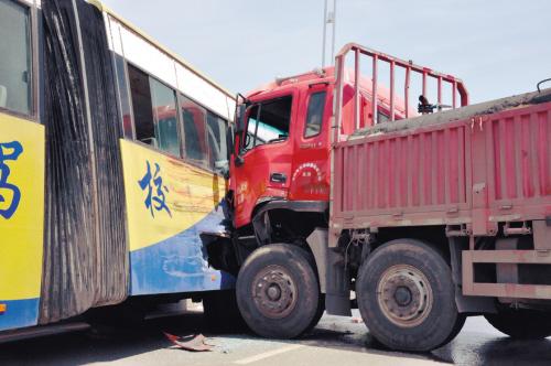 ????????記者觀察到,大客車側(cè)面寫有“交通駕?!币恍写笞?,車頭朝西車尾朝東停著,右側(cè)車身被橋墩緊緊卡住;運(yùn)水罐車長近20米,車身與大客車車身幾乎呈90度直角,運(yùn)水罐車車頭撞在大客車的左后側(cè),將大客車撞癟了。事發(fā)地點(diǎn)位于橋坡處,地面遍布七零八落的玻璃碎片,運(yùn)水罐車下面還有少量血跡。運(yùn)水罐車和大客車內(nèi)均空無一人。