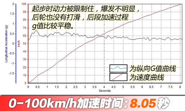 ????雖然可以關(guān)閉穩(wěn)定系統(tǒng),但感覺(jué)卻對(duì)發(fā)動(dòng)機(jī)輸出非常保守,變速箱也不允許拉到很高的轉(zhuǎn)速。起步后車輪沒(méi)有明顯滑動(dòng),說(shuō)明并沒(méi)有達(dá)到最佳輸出狀態(tài),最終成績(jī)?yōu)?.05秒,成績(jī)與老款車型有差距,略有遺憾。
