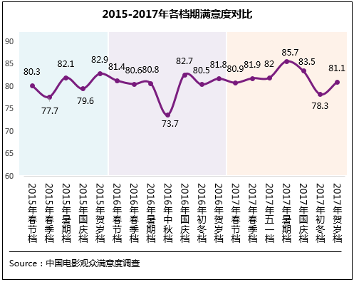 2017年賀歲檔影片獲得了觀眾較好的評(píng)價(jià),檔期滿(mǎn)意度得分81.1分,位于歷史調(diào)查19個(gè)檔期的第十名,居于中段水平。其中檔期觀賞性得分83.1分,思想性得分82.1分,均居于年內(nèi)第三、歷史第四位的領(lǐng)先水平。