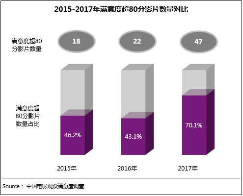 截止賀歲檔,2017年滿(mǎn)意度調(diào)查的重點(diǎn)國(guó)產(chǎn)片數(shù)量為67部,其中滿(mǎn)意度高于80分的影片數(shù)量為47部,占比超70%;而2015、2016年滿(mǎn)意度超80分的影片總數(shù)為40部,占比僅在40%左右。