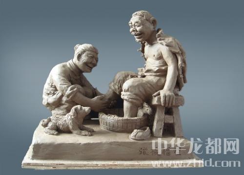 《老來伴》作品長50cm、寬35cm、高46cm。作品表現(xiàn)的是:老漢干了一天的農活兒回到家里,老婆用溫水給老漢洗洗腳,消除一天的疲勞,表達了老夫老妻恩恩愛愛、相濡以沫、白頭偕老。