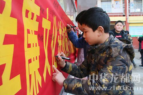中華龍都網(wǎng)訊(周口報(bào)業(yè)全媒體記者 韋偉 通訊員 王佳佳 辛曼 攝)今年是毛澤東“向雷鋒同志學(xué)習(xí)”題詞55周年。3月5月,沈丘縣紀(jì)委監(jiān)委聯(lián)合縣義工聯(lián)走進(jìn)沈丘二高、河南小學(xué),開展“孝廉文化進(jìn)校園”活動(dòng),旨在弘揚(yáng)雷鋒精神和“孝善儉廉”的美德。圖為:學(xué)生們?cè)凇昂霌P(yáng)雷鋒精神,做‘孝善儉廉’美德少年”條幅前簽字。