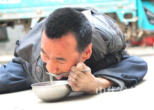 媽媽乘上一碗放在地上,紅印坐在墊子上,用腳夾著勺子,彎下腰來(lái)吃得很香??吹郊t印吃飯那么費(fèi)力,在場(chǎng)人心里酸酸的,為紅印自強(qiáng)不息所打動(dòng)著??墒钱?dāng)初娘倆可沒(méi)少流眼淚,李新蘭發(fā)現(xiàn)兒子兩只腳是靈活完好的,就開(kāi)始訓(xùn)練他用腳吃飯、洗臉。養(yǎng)大一個(gè)正常的孩子尚且不易,何況是張紅印這樣的孩子?李新蘭一遍遍地教,年幼的張紅印一遍遍地學(xué)。難為到受不了時(shí),娘倆就抱在一起哭。