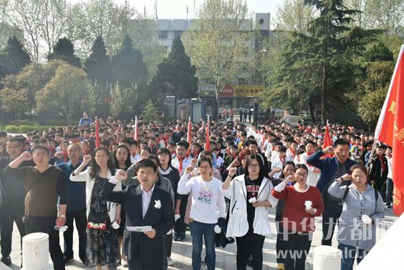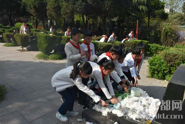 上午八點半,400余名學生衣著整潔,佩戴紅領巾,手握自備白花,排著整齊的隊伍從學校出發(fā),懷著對烈士無限崇敬的心情來到周口烈士陵園,佇立在傲然聳立的烈士紀念碑前,莊嚴肅穆的悼念活動開始了。升國旗、唱國歌、敬隊禮,黨員教師在烈士紀念碑前重溫入黨誓詞,少先隊員代表向烈士墓敬獻花圈,全體師生向烈士鞠躬默哀。