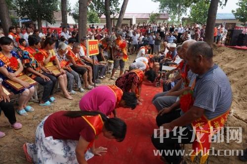 儀式上宣布了對(duì)前何行政村31戶孝老愛親之家進(jìn)行表彰的決定,并為他們頒發(fā)了“馬廠鎮(zhèn)孝老愛親之家”牌匾。在《愛的奉獻(xiàn)》樂曲伴奏下,31個(gè)孝老愛親之家的孝順兒子、孝順兒媳婦向自己的父母行跪拜之禮。
