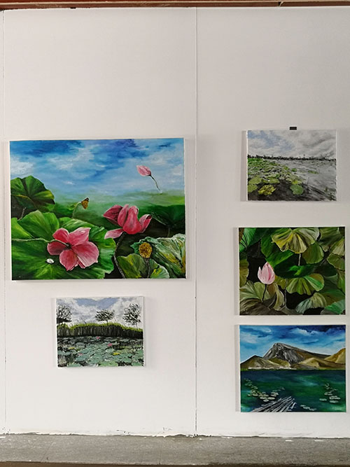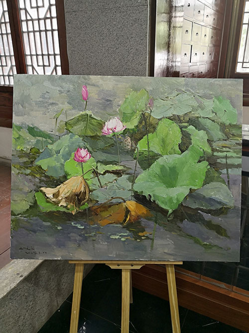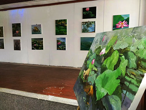 在龍湖荷花盛開(kāi)的季節(jié),女詩(shī)人油畫(huà)家三色堇、娜仁琪琪格、愛(ài)斐兒、暖玉、白芳芳、劉文文一行6人,來(lái)到周口進(jìn)行寫(xiě)生觀(guān)摩,開(kāi)展老莊文化交流、伏羲太極文化傳播等公益活動(dòng)。7月17日上午開(kāi)展女詩(shī)人油畫(huà)家寫(xiě)生作品展,豐富多樣的活動(dòng)成為淮陽(yáng)荷花節(jié)一濃墨重彩的一筆。