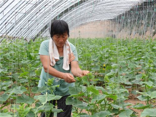 近年來,沈丘縣周營鎮(zhèn)大力發(fā)展藥材種植和特色瓜果蔬菜種植,既解決了貧困戶的就業(yè)問題,又促進了當?shù)剞r(nóng)業(yè)生產(chǎn)。圖為7月24日,貧困群眾孫素英在蔬菜種植基地管理吊籐晚秋小黃瓜。 記者 韋偉 通訊員 謝辛凌 攝