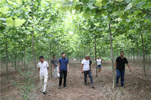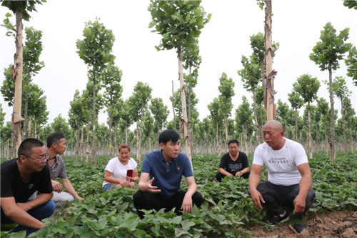 與前廟相鄰的大張村,是一個“天然大氧吧”。從大張村走出來的曹紅星在鄭州從事園林綠化多年,在朱口鎮(zhèn)黨委、鎮(zhèn)政府的支持和鼓勵下,他以1000元/畝的價格流轉(zhuǎn)了1000多畝土地,種植法桐、欒樹、國槐等綠化樹。有著豐富經(jīng)驗的曹紅星在種植綠化樹的同時,積極發(fā)展林下經(jīng)濟,在綠化樹下種植紅薯、大蒜等,有效提高了土地的利用率,經(jīng)濟效益顯著提高?!捌綍r,綠化林地除草、抗旱、施肥需要用工,收種紅薯、大蒜等也需要用工,用工時貧困戶優(yōu)先。只要有勞動能力,來這里就能掙錢?!辈芗t星說,林業(yè)經(jīng)濟的快速發(fā)展為鄉(xiāng)親們脫貧致富提供了保障。