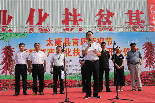 8月22日,太康縣首屆辣椒節(jié)暨辣椒產(chǎn)業(yè)化扶貧基地現(xiàn)場會在龍曲鎮(zhèn)紅云來辣椒產(chǎn)業(yè)扶貧基地召開。太康縣人大副主任、黨組副書記竇勝利,縣政府副縣長張國慶,縣公安局局長李根闖等領(lǐng)導(dǎo)和相關(guān)人員出席會議。竇勝利宣布開幕,張國慶講話并致辭,會議由龍曲鎮(zhèn)黨委書記趙云華主持。