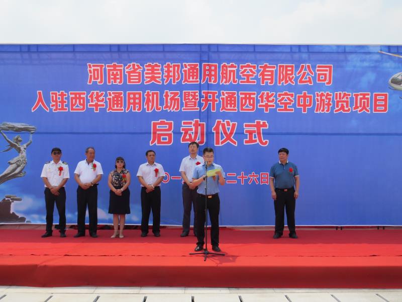 8月26日,河南省美邦通用航空有限公司入駐西華通用機(jī)場暨開通西華空中游覽項(xiàng)目啟動(dòng)儀式在西華縣南廣場舉行,西華縣委常委、常務(wù)副縣長王獻(xiàn)超,西華縣人大常委會(huì)副主任龐友敬,西華經(jīng)開區(qū)管委會(huì)主任宋廣良,西華經(jīng)濟(jì)技術(shù)開發(fā)區(qū)城市投資有限公司總經(jīng)理朱洪江;美邦控股集團(tuán)總經(jīng)理、河南省美邦通用航空有限公司董事長王洪濤等出席啟動(dòng)儀式。