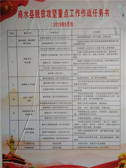 “‘脫貧攻堅(jiān)重點(diǎn)工作作戰(zhàn)任務(wù)書(shū)’既是作戰(zhàn)圖、也是軍令狀,每個(gè)時(shí)間點(diǎn)開(kāi)展哪些工作、達(dá)到什么效果、采取何種措施,都在‘作戰(zhàn)任務(wù)書(shū)’上顯現(xiàn)了出來(lái)?!?月5日上午,商水縣練集鎮(zhèn)朱集村脫貧責(zé)任組組長(zhǎng)陳書(shū)敬指著張貼在村辦公室內(nèi)的“商水縣脫貧攻堅(jiān)重點(diǎn)工作作戰(zhàn)任務(wù)書(shū)”說(shuō)。