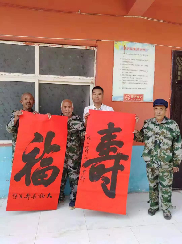 鄲城縣衛(wèi)計(jì)委駐虎崗鄉(xiāng)虎崗行政村第一書記王忠樸,是鄲城縣書法協(xié)會(huì)副主席兼秘書長,在他的牽線下,鄲城縣書法協(xié)會(huì)主席巴云山帶領(lǐng)10多名書法協(xié)會(huì)會(huì)員前來助陣,與敬老院里懂書法的老人一起揮毫潑墨。