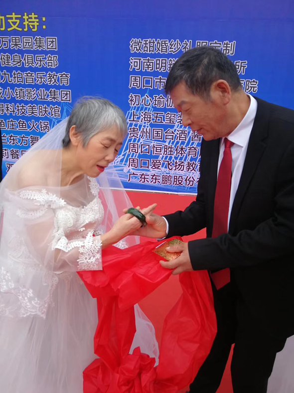 10月19日上午,在周口宏德養(yǎng)老孝道文化節(jié)上,18對(duì)老人身著盛裝參加老年集體婚禮。典禮開始后,18對(duì)老人手牽紅絲帶走上舞臺(tái),經(jīng)過現(xiàn)代式結(jié)婚典禮流程后,老人們互贈(zèng)禮物。老人們非常激動(dòng),他們相互擁抱,有的還流下了眼淚。臺(tái)下的子女也激動(dòng)萬分,紛紛走上舞臺(tái)與自己的父母擁抱在一起。