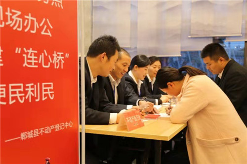 11月10日至13日,鄲城縣不動產(chǎn)登記中心緊緊圍繞“服務(wù)群眾、服務(wù)民生”,用釘釘子的精神,苦練繡花功夫,創(chuàng)新服務(wù)方式,主動貼近服務(wù),擦亮“小窗口”,進(jìn)駐剛開盤的樓盤,積極搭建起便民利民“連心橋”,真正做到讓信息多跑路、讓群眾少跑路,實(shí)現(xiàn)了“流程順暢、高效便捷、群眾滿意”的業(yè)務(wù)辦理,受到了辦事群眾和企業(yè)的高度稱贊。