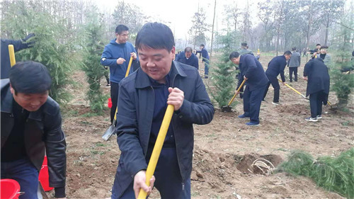 當(dāng)天下午雖然暖陽(yáng)照射,但初冬的鹿邑大地仍是涼風(fēng)習(xí)習(xí)。不過(guò)這一點(diǎn)兒也沒(méi)有影響到大家的心情。一到植樹(shù)現(xiàn)場(chǎng),梁建松、李剛等領(lǐng)導(dǎo)就和大家一起興致勃勃地拿起鐵鍬等工具忙碌起來(lái),揮鍬鏟土,扶樹(shù)填土,澆水正苗,每道工序都做得認(rèn)真細(xì)致、一絲不茍。