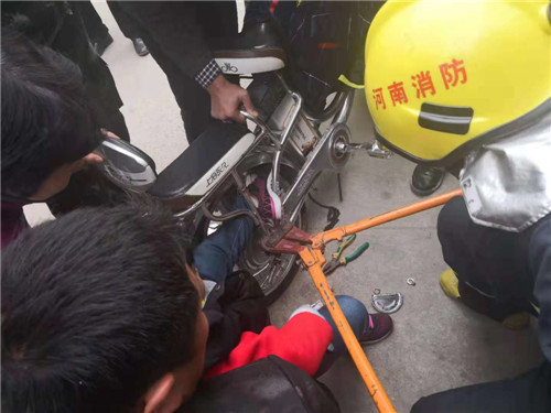 11月15日8時許,鄲城縣消防指揮中心接到報警:新華路逸品香山門口有一女童腳被電動車后輪卡住,急需救助。