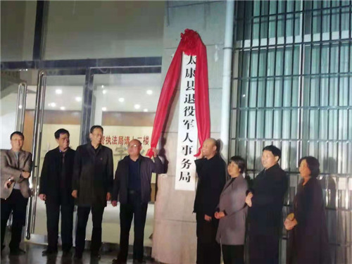 11月27日,太康縣退役軍人事務局掛牌成立。縣委常委、常務副縣長張保華,縣委常委、副縣長韓維俊,縣政協(xié)副主席、縣民政局局長劉鳳芹出席揭牌儀式??h編辦主任毛雙龍、縣退役軍人事務局干部職工參加揭牌儀式。