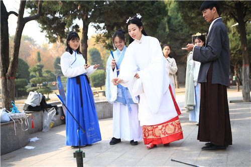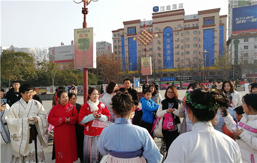 11月25日,周口的漢服同袍以“漢服出行,不忘初心”為主題自發(fā)相約在人民公園、五一廣場等地向行人宣傳漢服文化。