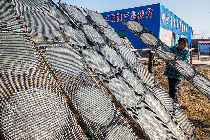 寒冬,河南省沈丘縣付井鎮(zhèn)楊莊村子里,一個(gè)個(gè)制作粉皮的工棚里爐火正旺,熱氣騰騰的大鍋里漂出一張張粉皮。田野中,到處是晾曬粉皮的場(chǎng)景,真是難得一見。