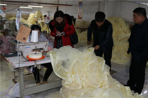 “對于有勞動能力的貧困戶及留守婦女,只要報名一律錄用,根據(jù)個人能力提供合適崗位,免費進行業(yè)務技能培訓,變‘輸血’變‘造血’;成為熟練工的貧困戶,月收入均可達到3000元以上。”金凱盛家紡“扶貧車間”位于吳小廟村邊,該公司負責人趙開軍是楊湖口鎮(zhèn)走出去打工、在事業(yè)有成后返鄉(xiāng)創(chuàng)業(yè)的一個普通80后,他的公司總部位于江蘇省南通市,像這樣的幾百人加工基地附近有二三家,加工的產品一般是通過天貓、京東等知名電商平臺在全國進行銷售,實行網上實行統(tǒng)一下單、就近發(fā)貨,這幾個基地主要負責長江以北市場銷售,公司去年年銷售額已突破5000萬元,解決周邊村莊數(shù)千人在門口就業(yè),帶動100多戶貧困戶脫貧。