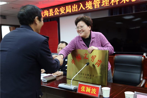 12月26日,扶溝縣長張穎波向榮獲河南省“巾幗文明崗”的縣公安局出入境管理科授牌儀式在縣公安局九樓會(huì)議室舉行。副縣長任松奎,縣政府黨組成員、縣公安局局長田豪杰,縣公安局政委石偉等出席授牌儀式。