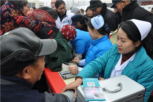 正在排隊量血壓的馬河村村民馬長運(yùn)說:“我今年70多歲,血壓有點(diǎn)高,聽說這 里有義診活動,一大早便來這里等待了。”