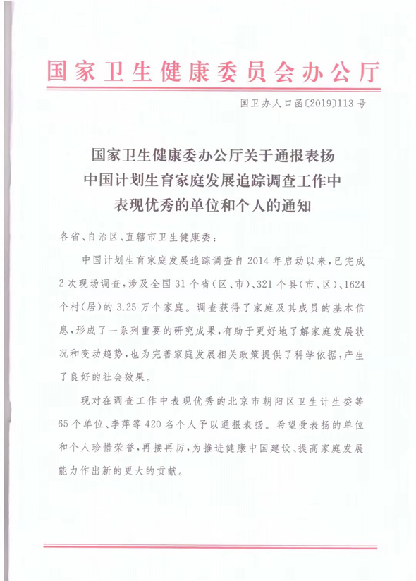 通知顯示,中國(guó)計(jì)劃生育家庭發(fā)展追蹤調(diào)查自2014年啟動(dòng)以來,已完成2次現(xiàn)場(chǎng)調(diào)查,涉及全國(guó)31個(gè)?。▍^(qū)、市)、321個(gè)縣(市、區(qū))、1624個(gè)村(居)的3.25萬(wàn)個(gè)家庭。調(diào)查獲得了家庭及其成員的基本信息,形成了一系列重要的研究成果,有助于更好地了解家庭發(fā)展?fàn)顩r和變動(dòng)趨勢(shì),也為完善家庭發(fā)展相關(guān)政策提供了科學(xué)依據(jù),產(chǎn)生了良好的社會(huì)效果。國(guó)家衛(wèi)健委對(duì)在此項(xiàng)工作中表現(xiàn)優(yōu)秀的65個(gè)單位、420名個(gè)人進(jìn)行通報(bào)表?yè)P(yáng),希望受表?yè)P(yáng)的單位和個(gè)人珍惜榮譽(yù),再接再厲,為推進(jìn)健康中國(guó)建設(shè)、提高家庭發(fā)展能力作出新的更大的貢獻(xiàn)。