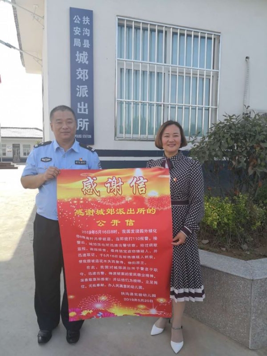 5月20日上午,扶溝縣實(shí)驗(yàn)幼兒園把一封感謝信送到城郊派出所民警手中,表達(dá)對該所民警迅速出警,快速辦案的敬意和謝意。