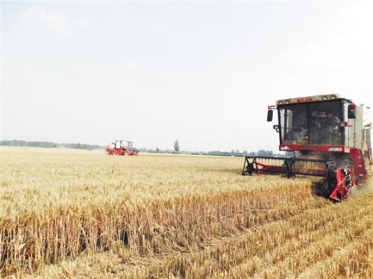 5月28日,沈丘縣周營(yíng)鎮(zhèn)歐營(yíng)行政村的麥田里,兩臺(tái)大型收割機(jī)正在緊張工作。眼下,該縣102萬畝小麥已陸續(xù)成熟,當(dāng)?shù)剞r(nóng)民緊抓有利天氣條件搶收小麥。謝辛凌 攝