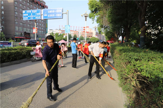 6月4日,烈日炙烤著大地,氣溫升至37攝氏度,路面溫度更高。鄲城縣財政局長張振新帶領“創(chuàng)衛(wèi)”值班人員,正在新華路西段責任區(qū)內清掃路面、撿拾落葉、噴灑花木、落實“門前五包”……大家忙得汗流浹背,始終無一人脫崗。
