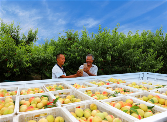 6月19日,在萬畝桃園里,桃農(nóng)臉上洋溢著收獲的喜悅,看見記者拍照,熱情地從籃里桃了一個又大又紅的鮮桃遞給記者品嘗(圖一)。一名慕名而來的游客購買了十幾斤鮮桃后掏出手機掃描桃農(nóng)的手機微信收款碼支付(圖二)。