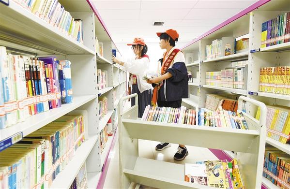 7月2日,在圖書館,參加“我當(dāng)小圖書管理員”社會實踐活動的學(xué)生在整理圖書。