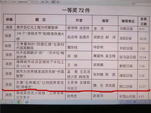 據(jù)介紹,本屆河南新聞獎(jiǎng)獲獎(jiǎng)作品具有“把握時(shí)代脈搏 謳歌時(shí)代精神”“反映重大主題 積極服務(wù)大局”“講述中國(guó)故事 彰顯主流價(jià)值”等特點(diǎn),主題深刻、事實(shí)準(zhǔn)確、文風(fēng)生動(dòng)、表現(xiàn)新穎,充分反映我省新聞戰(zhàn)線積極宣傳報(bào)道黨的十八大以來(lái)我省發(fā)展的歷史成就、歷史變革,報(bào)道我省各行各業(yè)改革開(kāi)放的豐碩成果和感人事跡,特別是聚焦打贏精準(zhǔn)扶貧攻堅(jiān)戰(zhàn),形成宣傳的強(qiáng)大聲勢(shì)。作品堅(jiān)持正確的輿論導(dǎo)向、唱響主旋律、大力宣傳社會(huì)主義核心價(jià)值觀,為新時(shí)代中原更加出彩提供強(qiáng)有力的輿論支撐和良好的輿論氛圍?!短怠拔屦B(yǎng)模式”讓特困養(yǎng)老實(shí)現(xiàn)“菜單式”》具有“重大題材”“重大影響”“重大意義”等特點(diǎn),經(jīng)過(guò)專(zhuān)家層層評(píng)審,最終在眾多參評(píng)作品中脫穎而出,一舉奪得了河南新聞獎(jiǎng)一等獎(jiǎng)。