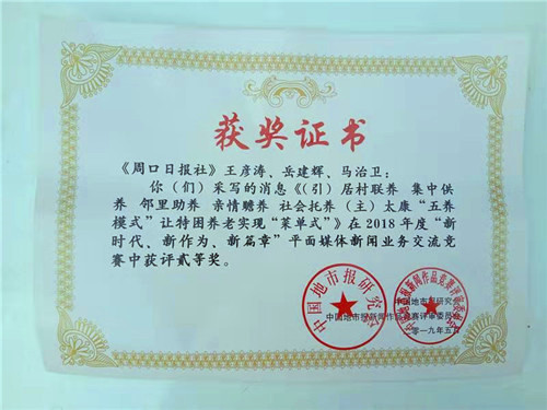 中國(guó)地市報(bào)新聞獎(jiǎng)評(píng)選活動(dòng)由中國(guó)地市報(bào)研究會(huì)主辦,每年舉辦一次,在全國(guó)有著廣泛的影響,此項(xiàng)新聞獎(jiǎng)評(píng)選活動(dòng)涉及全國(guó)幾乎所有地市黨報(bào),不僅是展示地市黨報(bào)形象的重要舞臺(tái),也是衡量地市黨報(bào)辦報(bào)水平的重要標(biāo)志,同時(shí)也是以新聞的形式展示各地亮點(diǎn)工作的重要。《太康“五養(yǎng)模式”讓特困養(yǎng)老實(shí)現(xiàn)“菜單式”》稿件在此項(xiàng)新聞獎(jiǎng)評(píng)選中,同樣表現(xiàn)不凡,最終榮獲中國(guó)地市報(bào)新聞獎(jiǎng)二等獎(jiǎng)。
