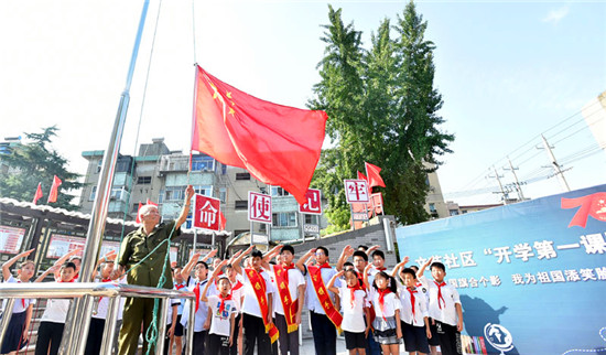 伴著雄壯的國(guó)歌聲,30多名孩子目不轉(zhuǎn)睛地看著國(guó)旗冉冉升起……為迎接新中國(guó)成立70周年,近日,江蘇省揚(yáng)州市邗江區(qū)雙橋街道文苑社區(qū)在社區(qū)國(guó)旗臺(tái)廣場(chǎng),組織開展了開學(xué)第一課“我與國(guó)旗合個(gè)影、我為祖國(guó)添笑臉”活動(dòng)。鮮艷的五星紅旗、燦爛的孩子笑臉,組成了一幅和諧美麗的畫面。