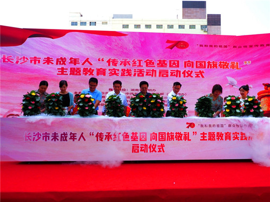 嘉賓們共同澆灌希望之花,啟動(dòng)長(zhǎng)沙市未成年人“傳承紅色基因 向國(guó)旗敬禮”主題教育實(shí)踐活動(dòng)。