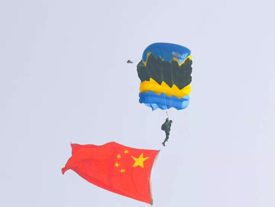 “看,跳傘表演開始了?!?0月29日上午,周口西華通用機場首航儀式結(jié)束后,一場精彩絕倫的飛行表演就開始了。載著跳傘運動員的飛機起飛到指定地點后,運動員攜帶著國旗和彩帶從高空中跳下,打開傘包后,空中五顏六色十分漂亮,引得圍觀群眾不時叫好。