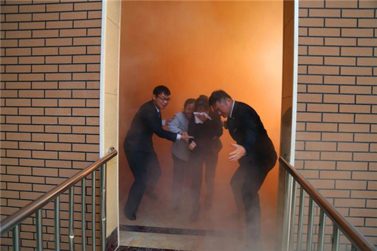 記者在現(xiàn)場(chǎng)看到,隨著消防警鈴的響起、煙霧的彌漫,來(lái)自物業(yè)公司和社區(qū)的數(shù)十名群眾彎著腰,同時(shí)用濕毛巾捂著口鼻,緊急而有序地從步梯撤出,與此同時(shí),消防隊(duì)員迅速將消防水袋和槍頭同消防栓相連接,并打開(kāi)消防栓對(duì)準(zhǔn)“火勢(shì)”,一瞬間,發(fā)生在建業(yè)社區(qū)的一場(chǎng)“火災(zāi)”被及時(shí)撲滅,現(xiàn)場(chǎng)圍觀的眾人爆發(fā)出陣陣掌聲。