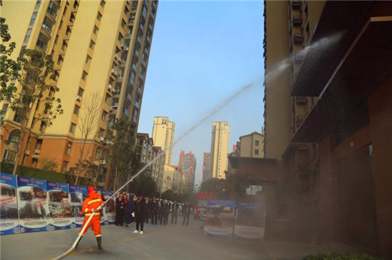當(dāng)日下午,高磊向參會(huì)人員演示并講解了滅火器的使用方法,并現(xiàn)場(chǎng)邀請(qǐng)社區(qū)干部和物業(yè)公司相關(guān)負(fù)責(zé)人員實(shí)際體驗(yàn)滅火器的使用。隨后,在建業(yè)森林半島小區(qū)開(kāi)展了消防演練活動(dòng)。