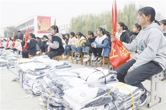當(dāng)日上午,太康縣毛莊鎮(zhèn)一中1800多名學(xué)生圍坐在操場上,看著面前碼放整齊的新校服,十分激動(如圖)。捐贈儀式開始后,太康萬城商貿(mào)董事長陳家濟等愛心人士,為學(xué)生挑選、試穿新校服。同學(xué)們抱著新校服,向好心的叔叔道謝。