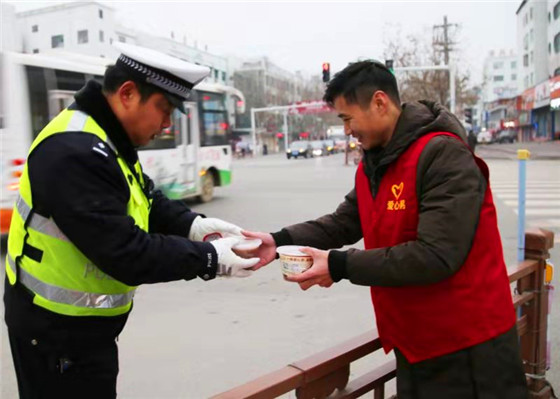 凌晨4時,志愿者便來到縣城南關愛心粥屋熬粥、炒菜,50多名志愿者6時便趕來拉著大桶的熱粥分赴老君臺、大隅首、北關另外三個志愿服務點,向環(huán)衛(wèi)工人、交警、工地務工人員派迭香甜的臘八粥。