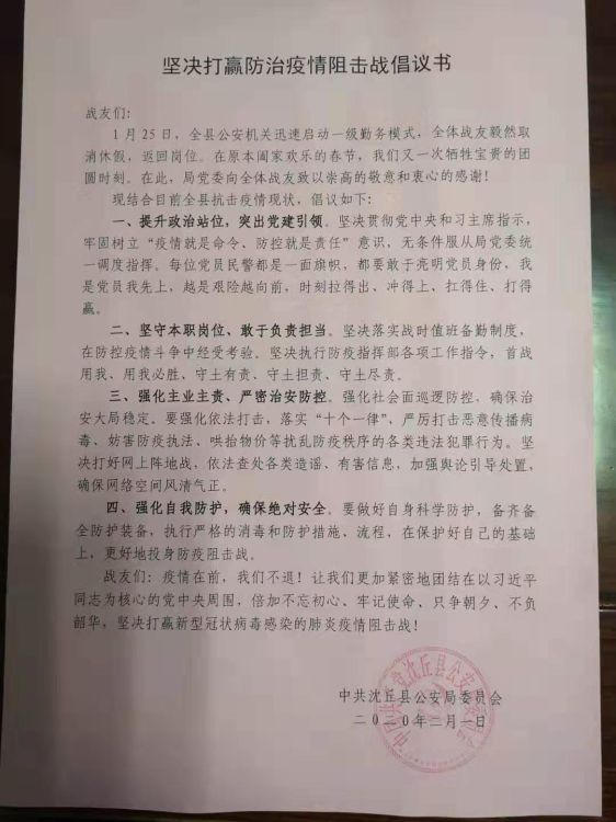 疫情就是命令!1月25日,接到上級一級勤務(wù)模式啟動的指令后,沈丘縣公安局黨委立即著手制定《防治新型冠狀病毒引發(fā)肺炎疫情期間思想政治工作要點》和《應(yīng)對疫情宣傳及輿論引導(dǎo)處置工作方案》。明確各黨總支(黨支部)及教導(dǎo)員、指導(dǎo)員等思想政治者的崗位職責(zé),同時在全局黨建工作群和青年民警工作群下發(fā),指導(dǎo)疫情防治期間的思想政治工作和輿情應(yīng)對處置工作。