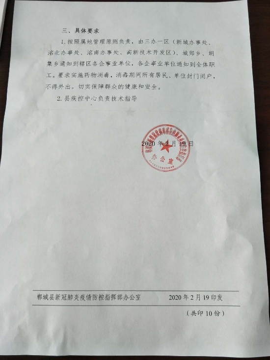 1.按照屬地管理原則負責,由三辦一區(qū)(新城辦事處、洺北辦事處、洺南辦事處、高新技術(shù)開發(fā)區(qū))、城郊鄉(xiāng)、胡集鄉(xiāng)通知到轄區(qū)各企事業(yè)單位,各企事業(yè)單位通知到全體職工。要求實施藥物消毒,消毒期間所有居民、單位封門閉戶,不得外出。切實保障群眾的健康和安全。